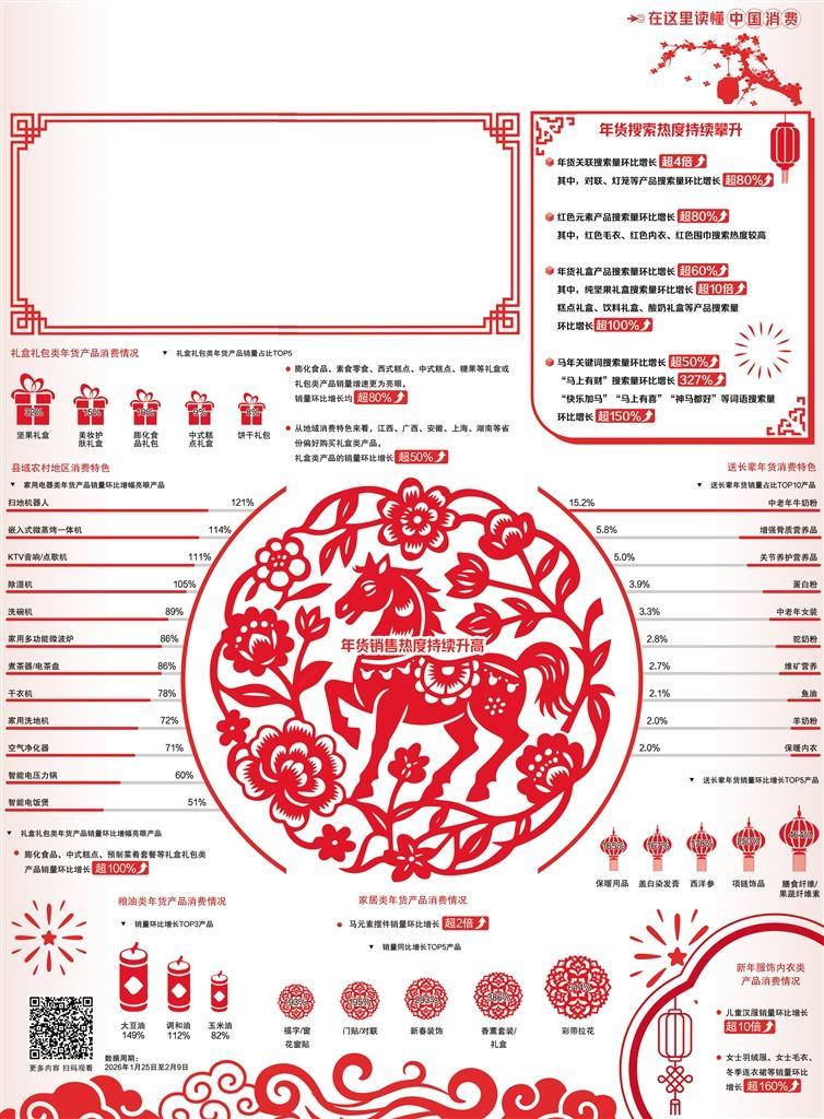 今年年貨消費,既有傳統(tǒng)年味的溫馨熱鬧,又有品質(zhì)生活的全新表達。從紅火喜慶的馬年裝飾、寓意吉祥的節(jié)慶禮盒,到智能家電、健康按摩、家政服務(wù)等新年貨走俏,再到春節(jié)旅行預(yù)訂火熱,折射出大眾消費從“圖熱鬧”向“重品質(zhì)、重實用、重心意”轉(zhuǎn)變。縣域農(nóng)村市場里,掃地機器人、智能廚電等成為返鄉(xiāng)孝敬長輩的熱門年貨,更是讓科技溫度融入團圓時刻。新舊交融、城鄉(xiāng)共進的年貨圖景,既藏著中國人不變的團圓情結(jié),也映照著煙火氣里不斷升級的美好生活。