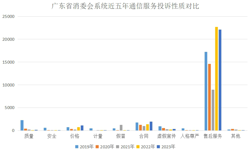 從投訴類別來(lái)看,近5年通信服務(wù)投訴95%以上集中在移動(dòng)電話服務(wù),與當(dāng)前通信業(yè)發(fā)展現(xiàn)狀相符(2023年廣東固話、移動(dòng)電話用戶數(shù)比例約為1:10)。從投訴性質(zhì)來(lái)看,消費(fèi)者反映的問題主要集中在售后服務(wù)、合同和價(jià)格3類,其中售后服務(wù)問題最為集中,占投訴總量的80.19%,是通信服務(wù)類投訴增長(zhǎng)變化的主要因素。從地區(qū)分布來(lái)看,通信服務(wù)投訴集中在消費(fèi)活躍的珠三角地區(qū),主要與經(jīng)濟(jì)發(fā)展?fàn)顩r、人員密集程度相關(guān)。
