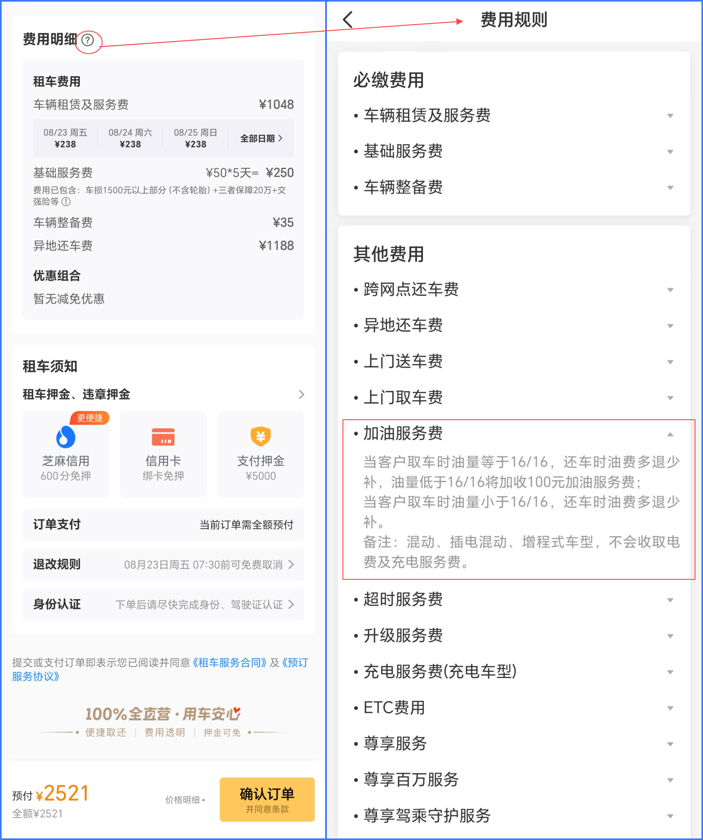 《中國消費者報》在神州租車APP上下單租車,經(jīng)過仔細找尋,發(fā)現(xiàn)必須點開“費用明細”旁邊一個不起眼的圓圈小問號圖標后,才會跳轉至標注著“費用規(guī)則”的清單。在“其他費用”一欄中包括了“加油服務費”,點開后灰色小字顯示“當客戶取車時油量等于16/16,還車時油費多退少補,油量低于16/16將加收100元加油服務費”。