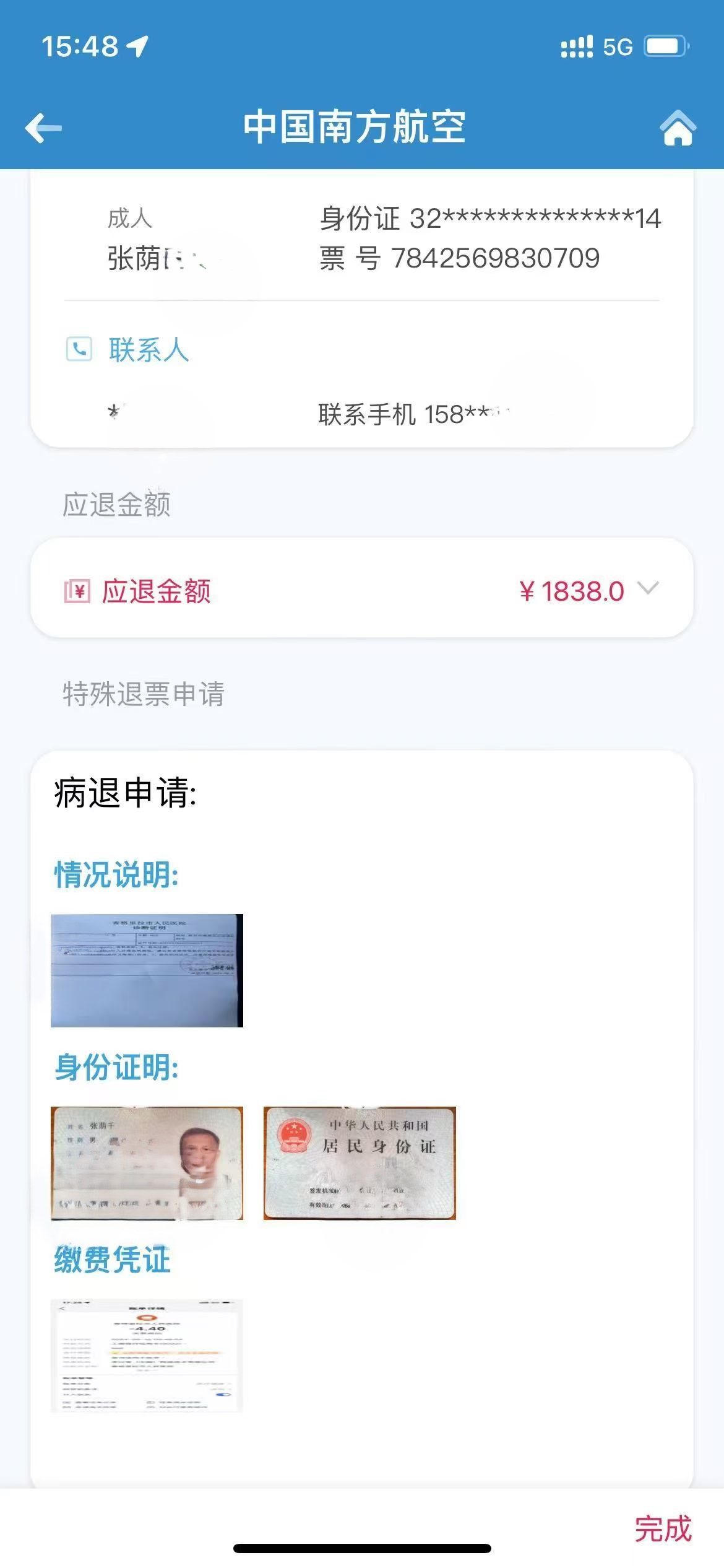 通過南航APP提交病退材料,只退回1838元。 消費者張先生供圖