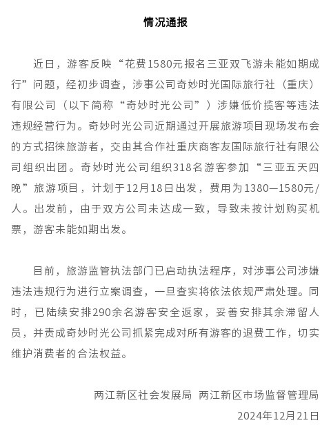 據(jù)通報(bào),經(jīng)初步調(diào)查,涉事公司奇妙時(shí)光國(guó)際旅行社(重慶)有限公司(以下簡(jiǎn)稱“奇妙時(shí)光公司”)涉嫌低價(jià)攬客等違法違規(guī)經(jīng)營(yíng)行為。奇妙時(shí)光公司近期通過(guò)開(kāi)展旅游項(xiàng)目現(xiàn)場(chǎng)發(fā)布會(huì)的方式招徠旅游者,交由其合作方重慶商客友國(guó)際旅行社有限公司組織出團(tuán)。奇妙時(shí)光公司組織318名游客參加“三亞五天四晚”旅游項(xiàng)目,計(jì)劃于12月18日出發(fā),費(fèi)用為每人1380至1580元。出發(fā)前,由于雙方公司未達(dá)成一致,導(dǎo)致未按計(jì)劃購(gòu)買(mǎi)機(jī)票,游客未能如期出發(fā)。