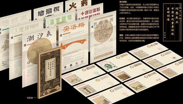 該系列紀(jì)念封由張泮儉、張慶鋒設(shè)計(jì),風(fēng)格整體統(tǒng)一又有特色,兼具科學(xué)與藝術(shù)之美,既能感受到傳統(tǒng)文化的古香古色,又在設(shè)計(jì)和制作上大膽創(chuàng)新。每類郵戳對照中國傳統(tǒng)色色譜進(jìn)行色系標(biāo)注,顏色有所區(qū)別。紀(jì)念封配有精美封套,通過主圖、郵戳、個(gè)性化郵票直觀表現(xiàn)科技成果,同時(shí)在封里增加了一張?jiān)O(shè)計(jì)精良的三折插頁卡片——頁式“說明書”,掃描封上二維碼,還可以觀看動(dòng)畫短片,參與互動(dòng)游戲。