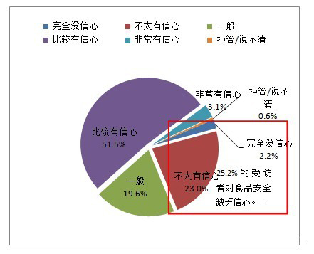 雖然,今年市民對(duì)食品安全比較有信心,但是食品安全問題現(xiàn)狀仍不可忽視,其中25.2%的市民對(duì)食品安全缺乏信心,51.5%的市民比較有信心,僅3.1%的市民非常有信心。