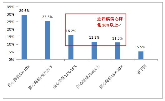 2)認(rèn)為未來(lái)一年食品安全狀況會(huì)變差的市民中,近四成信心降低10%以上,其中有一成市民信心降低程度超過(guò)了20%。