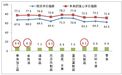 附圖 市民對(duì)九大食品未來(lái)信心評(píng)價(jià)指數(shù)與現(xiàn)狀指數(shù)