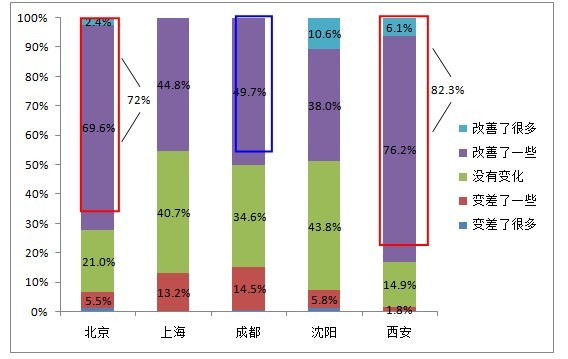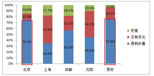 解讀一:過(guò)去一年,西安、北京對(duì)食品安全的改善情況最為滿意,成都最不滿意。