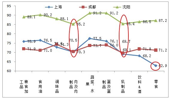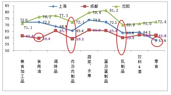 針對(duì)食品安全現(xiàn)狀信心指數(shù)較低的三個(gè)城市:上海、成都、沈陽(yáng)。沈陽(yáng)表現(xiàn)相對(duì)較好,信心指數(shù)較高;其次是上海;最低的是成都。其中肉及肉制品和乳制品在三大城市中的安全信心指數(shù)都相對(duì)偏低,直接影響了三大城市的綜合信心程度。此外,食用油在成都的安全信心指數(shù)、零食在上海的安全信心指數(shù)也有待提高。