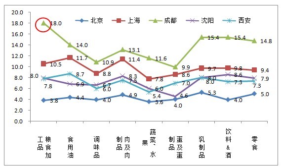 雖然成都、上海對(duì)食品安全過(guò)去一年的改善情況,現(xiàn)狀及未來(lái)發(fā)展趨勢(shì)都不是很樂(lè)觀,但是這兩個(gè)城市的安全信心指數(shù)增長(zhǎng)情況卻是最快的。尤其是成都,其糧食加工品的安全信心指數(shù)增長(zhǎng)高達(dá)18個(gè)點(diǎn)。