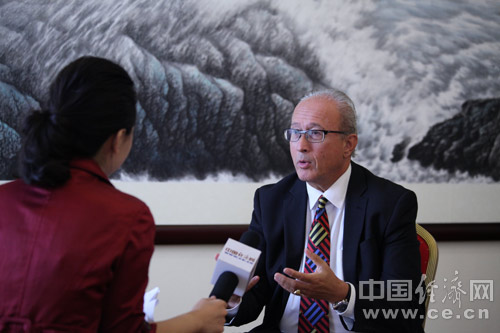 由中國道路交通安全協會、中國汽車技術研究中心和中國經濟網共同主辦的“2013中國道路交通安全論壇”于8月30日在北京首都大酒店舉行。圖為國際道路交通安全協會主席高斯接受中國經濟網記者采訪。中國經濟網 裴小閣/攝
