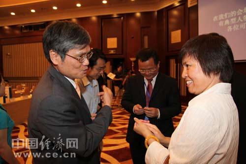 2013年全國食品安全宣傳周啟動儀式暨第五屆中國食品安全論壇6月17日在北京舉辦,今年主題為“社會共治 同心攜手維護食品安全”。圖為康師傅中央研究所所長楊乾輝與中國飲料工業(yè)協(xié)會理事長趙亞利進行交流。 中國經(jīng)濟網(wǎng) 郝紅波/攝