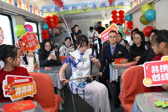 文藝表演環(huán)節(jié)精彩迭出,為旅途注入鮮活氣息。一曲《美麗家園》唱出游子對(duì)故鄉(xiāng)的深情眷戀,喚起旅客心中共同的團(tuán)圓情結(jié);舞蹈《草原花正開(kāi)》以舒展的舞姿、明快的節(jié)奏,勾勒出草原的遼闊生機(jī),仿佛提前帶來(lái)春的氣息;二胡獨(dú)奏《賽馬》激昂奔放,弦音如蹄,奏響新春的蓬勃朝氣,引來(lái)陣陣掌聲;《烏蘭巴托的夜》深情悠遠(yuǎn),撫慰旅途思念,增添一抹詩(shī)意的溫暖;最后的器樂(lè)彈唱《奔跑》以熟悉旋律點(diǎn)燃全場(chǎng),傳遞出向前奮進(jìn)的青春力量。