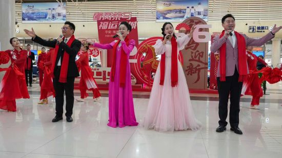 上午10時(shí)許,兩站文藝展演同步進(jìn)入高潮。由大連市總工會(huì)心連心藝術(shù)團(tuán)、鐵路大連機(jī)務(wù)段、大連鐵路物流中心、大連車(chē)務(wù)段、大連供電段、金州站、大連電務(wù)段、大連客運(yùn)段、大連工務(wù)段、大連車(chē)站派出所、大連北站車(chē)站派出所和大連站多家單位聯(lián)合呈現(xiàn)的精彩表演,在兩站輪番上演。大連站內(nèi),身著民族服飾的表演者們演繹的《美麗中國(guó)》舞姿翩躚;獨(dú)唱《下個(gè)路口》余音裊裊,舞蹈《我愿全速奔向你》青春洋溢引得旅客頻頻點(diǎn)頭稱(chēng)贊。大連北站內(nèi),手勢(shì)舞《一路生花》溫柔治愈;古箏琵琶重奏《象王行》奏響古韻新聲;大連市文化館木偶皮影劇團(tuán)帶來(lái)的復(fù)州皮影戲《鶴與龜》《三只猴子》更是吸睛無(wú)數(shù),光影流轉(zhuǎn)間將傳統(tǒng)非遺的魅力傳遞給在場(chǎng)旅客。薩克斯獨(dú)奏《回家》的旋律緩緩流淌,與旅客歸鄉(xiāng)的心境完美契合,讓候車(chē)廳滿(mǎn)是溫情。