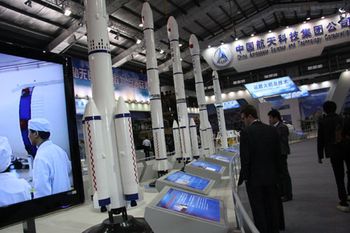 即將于2014年實(shí)現(xiàn)首飛的新一代大運(yùn)載火箭“長(zhǎng)征五號(hào)”模型高高地矗立著!伴L(zhǎng)二F”、“長(zhǎng)三甲”、“長(zhǎng)四乙”等白色箭體模型緊隨其后,一字排開(kāi),場(chǎng)面蔚為壯觀。很多電視媒體在采訪時(shí),都有意識(shí)地將長(zhǎng)征火箭或者“天宮一號(hào)”的模型作為背景。
