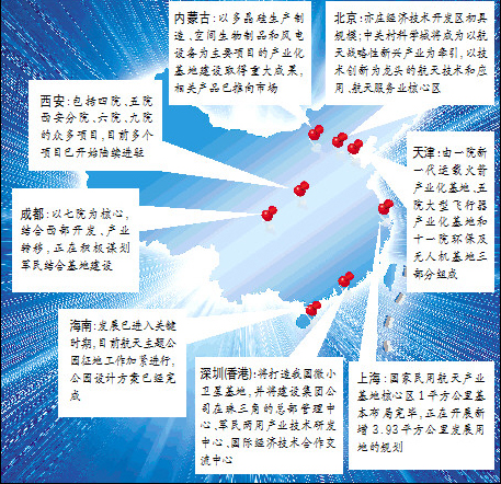 上海國家民用航天產業(yè)基地核心區(qū)1平方公里基本布局完畢,并正在開展新增3.93平方公里發(fā)展用地的概念性規(guī)劃和控制性詳細規(guī)劃。西安國家民用航天產業(yè)基地包括四院、五院西安分院、六院、九院的眾多項目,目前多個項目已開始陸續(xù)進駐。在四川成都,以七院為核心,結合西部開發(fā)、產業(yè)轉移,正在積極謀劃軍民結合基地建設。在中國北疆的內蒙古,集團公司以多晶硅生產制造、空間生物制品和風電設備為主要項目的產業(yè)化基地建設取得重大成果,相關產品已推向市場,取得了較好的經濟效益。